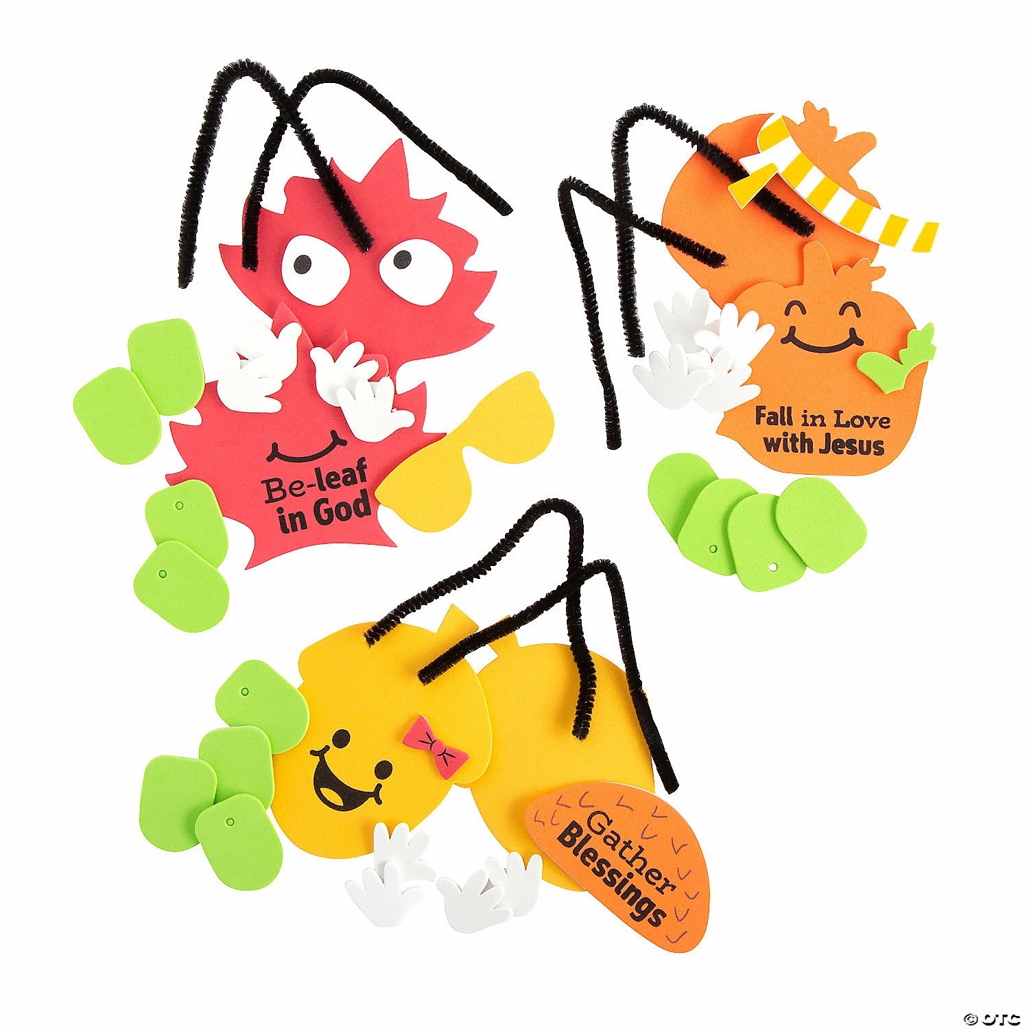 βFallβ in love with these adorable stand-up crafts featuring both faith and autumn themes. Kids will enjoy putting together these silly fall characters that each feature a faith message. βGather blessingsβ, βFall in love with Jesusβ and βBe-leaf in Godβ are simple faith messages with fall themes that young kids can understand. Includes self-adhesive foam pieces and chenille stems. 3″ x 5 1/2″ Makes 12. Kits include instructions. © OTC