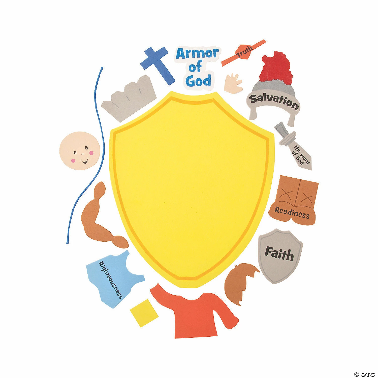 “Armor Of God” Craft Kit. Arm yourself with the “Armor of God” during Sunday School and VBS using this fun craft kit as a reminder of what each piece represents. The sword is “Thy world of God”, the helmet is “Salvation”, the armor is “Righteousness”, the belt reads “Truth”, the shield is “Faith” and “Readiness” are the boots. Includes self-adhesive foam pieces and boy and girl hairpieces. All craft kit pieces are pre-packaged for individual use. Kits include instructions and extra pieces. 9″ © OTC “Armor of God” Craft Kit Template/a