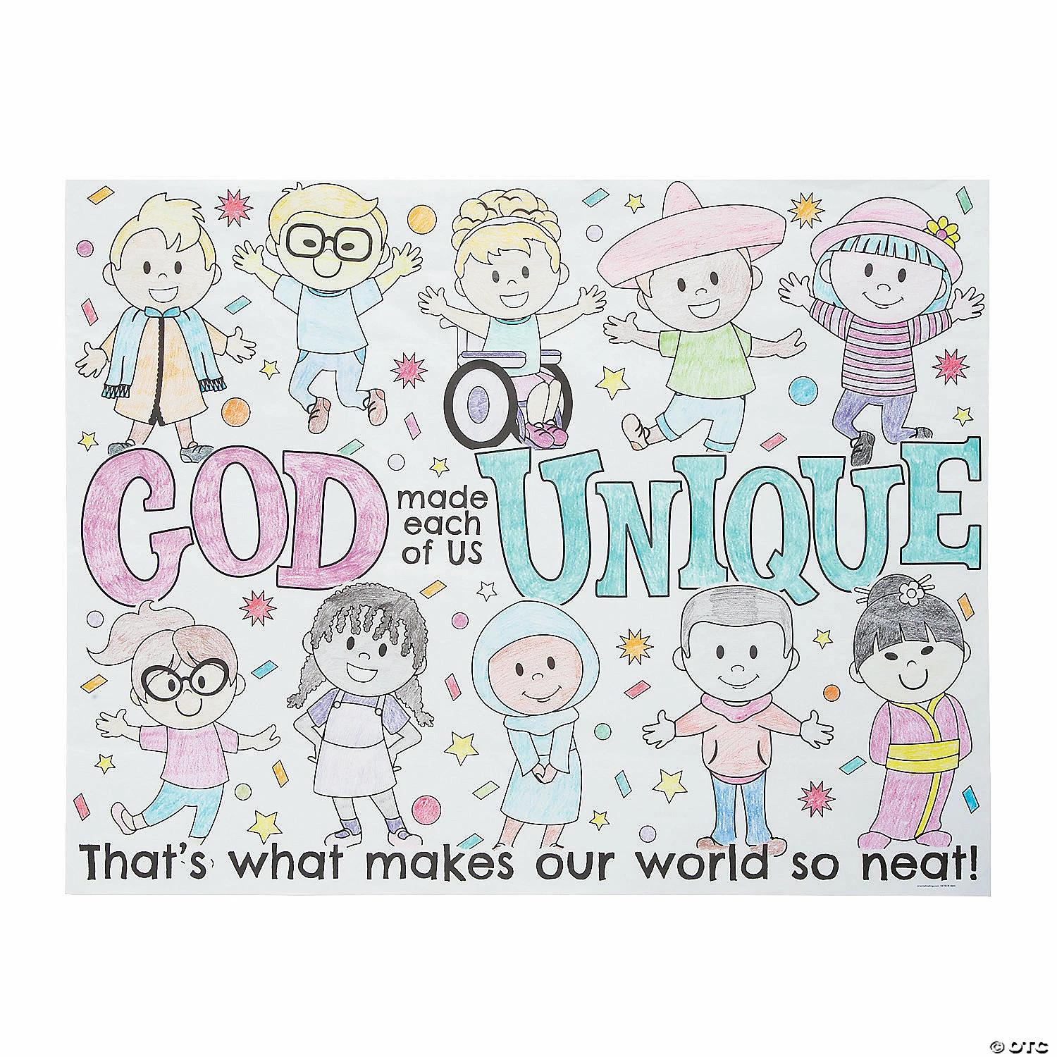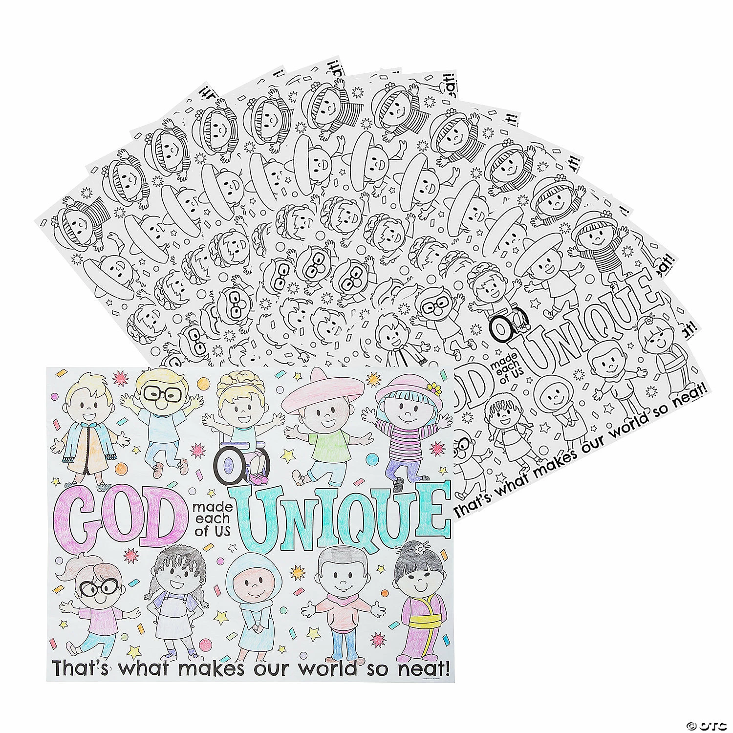 β’ HAVE A BLAST! β When it comes to creating art, the possibilities for fun are endless! Kids will have a blast coloring in their creations, and itβs a simple activity that can be a reward for good behavior in Sunday School.β’ DEVELOP FINE MOTOR SKILLS β Coloring involves the manipulation of small objects and requires several simultaneous actions like gripping and pressing. These motions help build the muscles of the fingers, hands and wrist. This church classroom aid is also a great way to help kids appreciate how everyone is made unique.β’ IMPROVE FOCUS & CONCENTRATION β How many times did your parents tell you to stay within the lines? Coloring encourages spatial awareness and helps kids focus on boundaries and lines. This color your own project will also improve their concentration.Product Description:Celebrate diversity with this fun color-your-own poster. Full of cartoon images of different kids, this poster has the message βGod made each of us unique, thatβs what makes our world so neat!β, making it a great choice for a Sunday School coloring project or home art activity for kids. This poster has plenty of room for coloring!Size: 22″ x 17″ Quantity: 30Material: PaperΒ© OTC