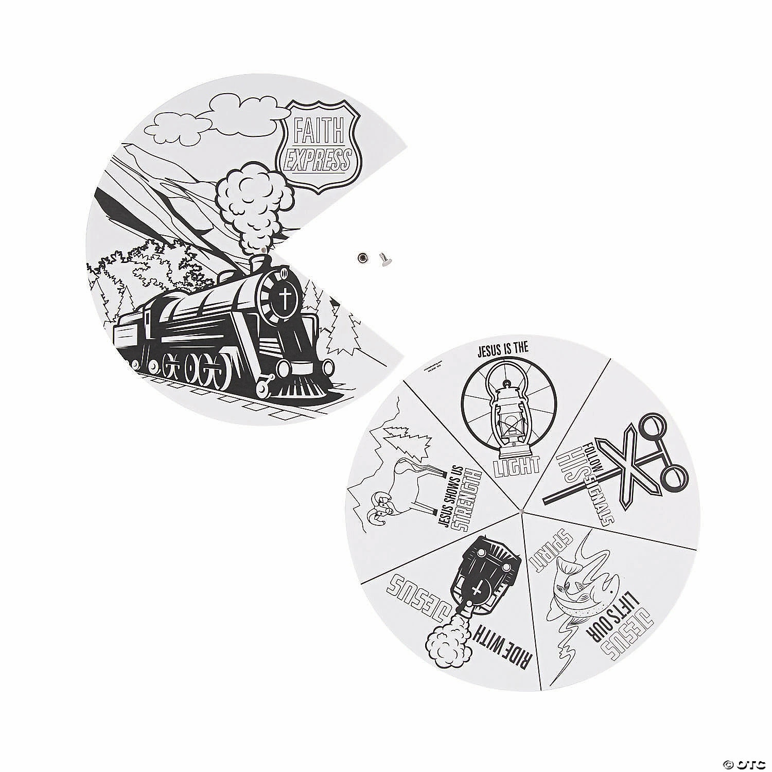 Keep VBS kids chugging right along with this fun railroad art project. Ready for coloring, these wheels feature railroad images and faith-filled messages. After coloring, kids attach both wheels together for a finished product that is interactive and inspirational. Whether used in VBS or Sunday School, this art project is one kids will be proud to take home. Cardstock with metal brad. 9″ diam. Β© OTC