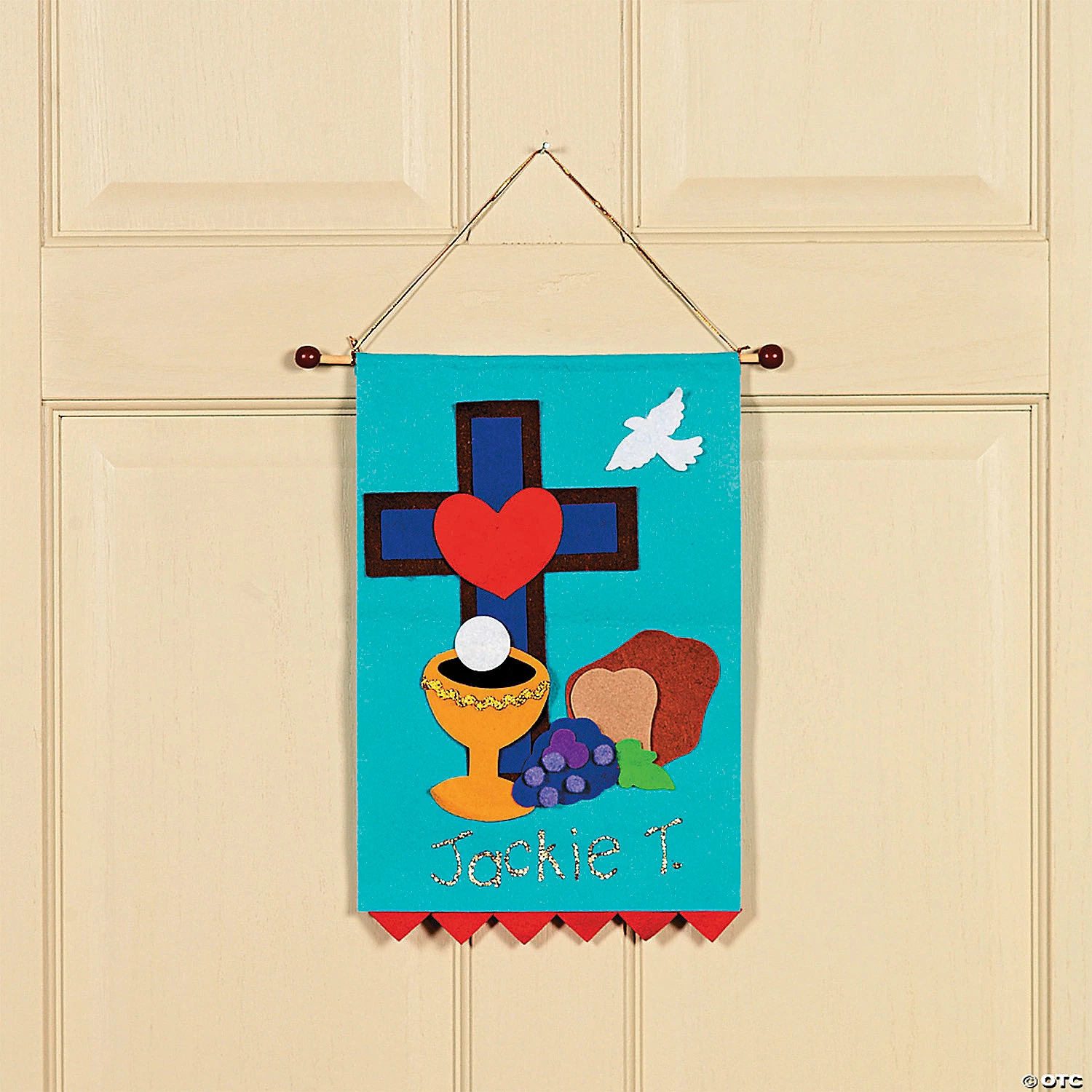 A memorable church craft, this Holy Communion banner makes an inspiring activity for Sunday School, youth group or other church events. Use glue to write your name, then sprinkle glitter on top! Includes felt pieces, glitter and a wooden dowel. 14″ All craft kit pieces are pre-packaged for individual use. Kits include instructions and extra pieces. We recommend using foam glue or Glue Dots, sold separately online. Β© OTC