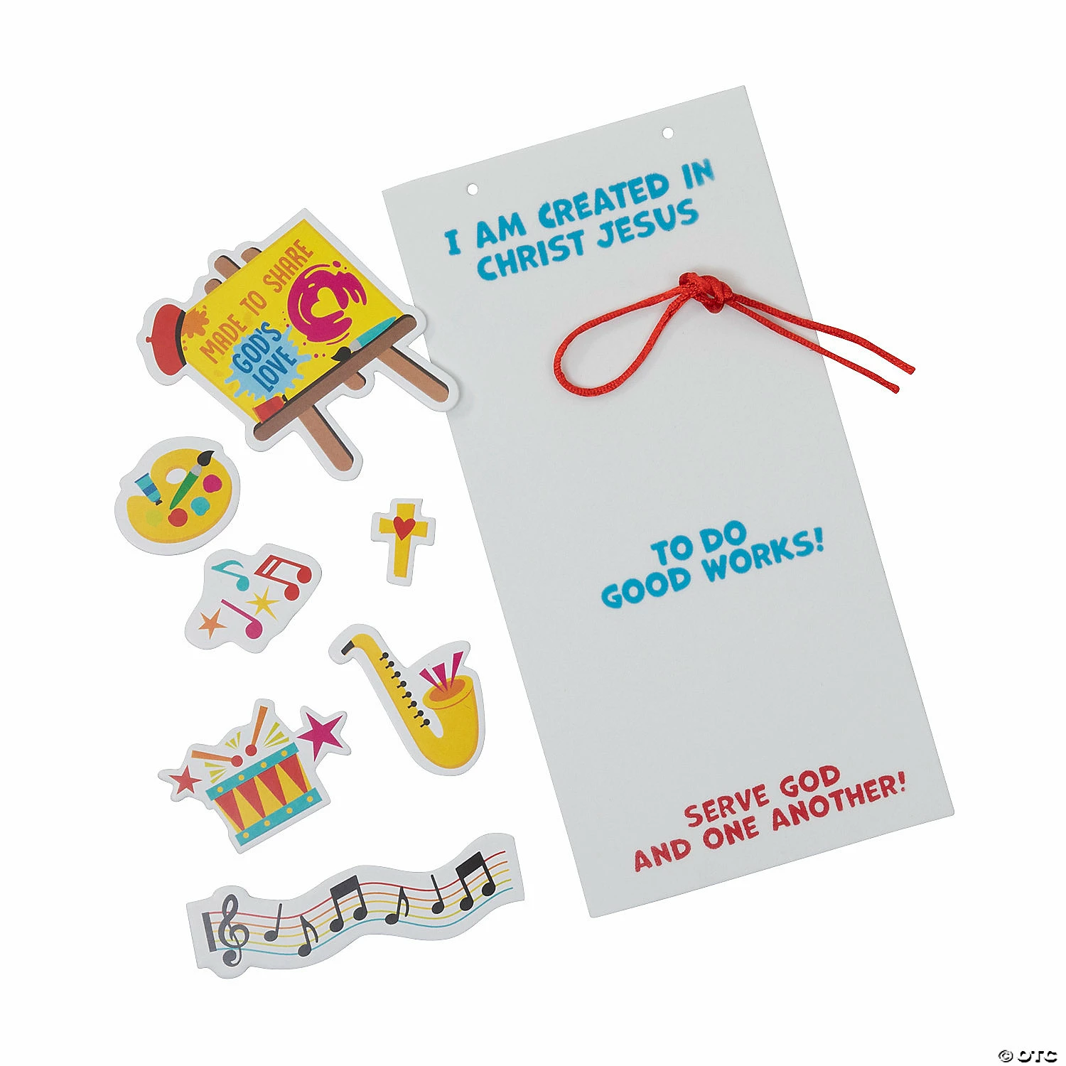 Help Studio VBS kids understand that they are made to share Godβs love with the help of this simple and fun craft kit. Perfect for Studio VBS, this craft kit creates up to a dozen colorful signs featuring images from the arts along with faith messaging. Add this peel-and-stick craft kit to you Studio VBS craft supplies! Includes self-adhesive foam pieces and satin cording. 4″ x 8″ Makes 12. All craft kit pieces are pre-packaged for individual use. Kits include instructions. Β© OTC