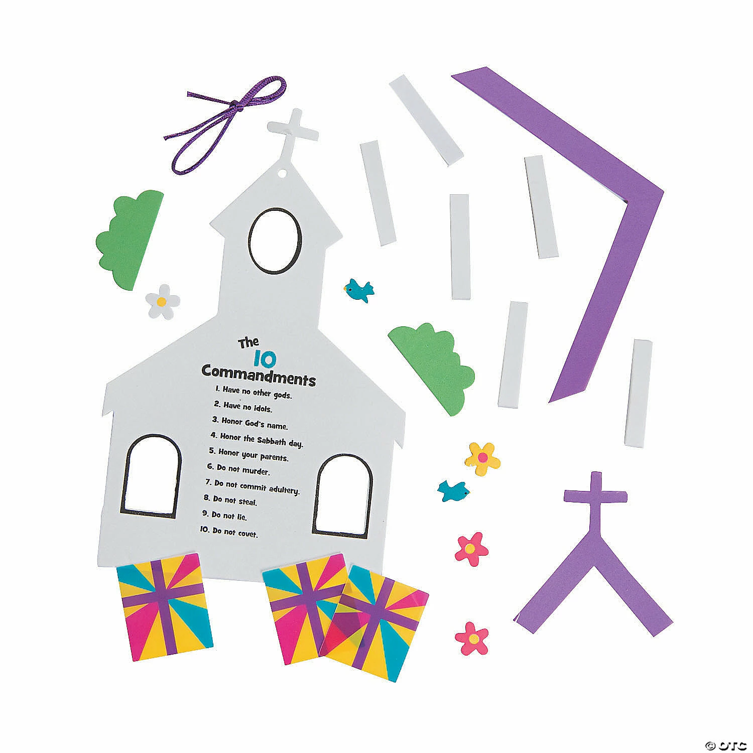 Just what you need to help teach little ones all about the Ten Commandments. Perfect for Sunday School craft projects, these completed signs look like colorful churches and come with each of the Commandments written out. Once it is finished, kids can display them in their bedrooms at home so they’ll see it every day and quickly learn this important Biblical list in no time! Includes self-adhesive foam pieces and satin cord for hanging. 5 1/4″ x 8 1/2″ Makes 12. All craft kit pieces are pre-packaged for individual use. Kits include instructions. Β© OTCTen Commandments for Kids Sign Instructions
